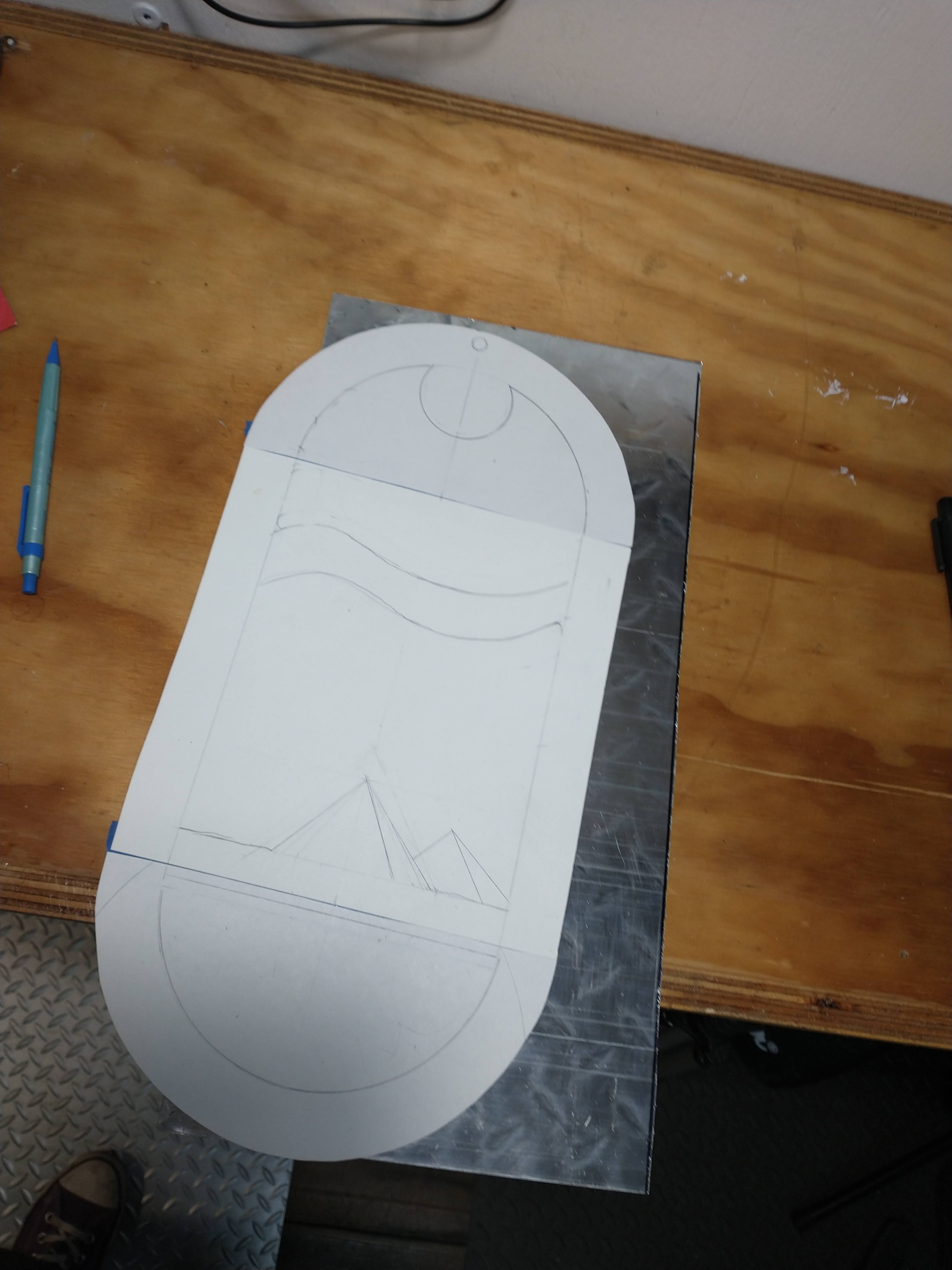 I glued the drawing(about 8" x 12") down to the aluminum diamond plate and then went and trimmed off the corners on the bandsaw down stairs.